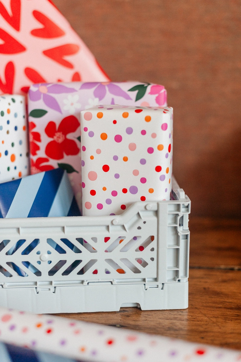 Box Consumentenrollen Basic cadeaupapier met 5 soorten dessins. Zorg dat klanten zelf hun cadeautjes kunnen inpakken met deze unieke kwaliteit cadeaupapier. Dubbelzijdige bedrukking, extra stevig papier & voorzien van een handige barcode. Per box ontvangt u 50 rollen van 70cm x 2m, presenteer de box eenvoudig in uw winkel.