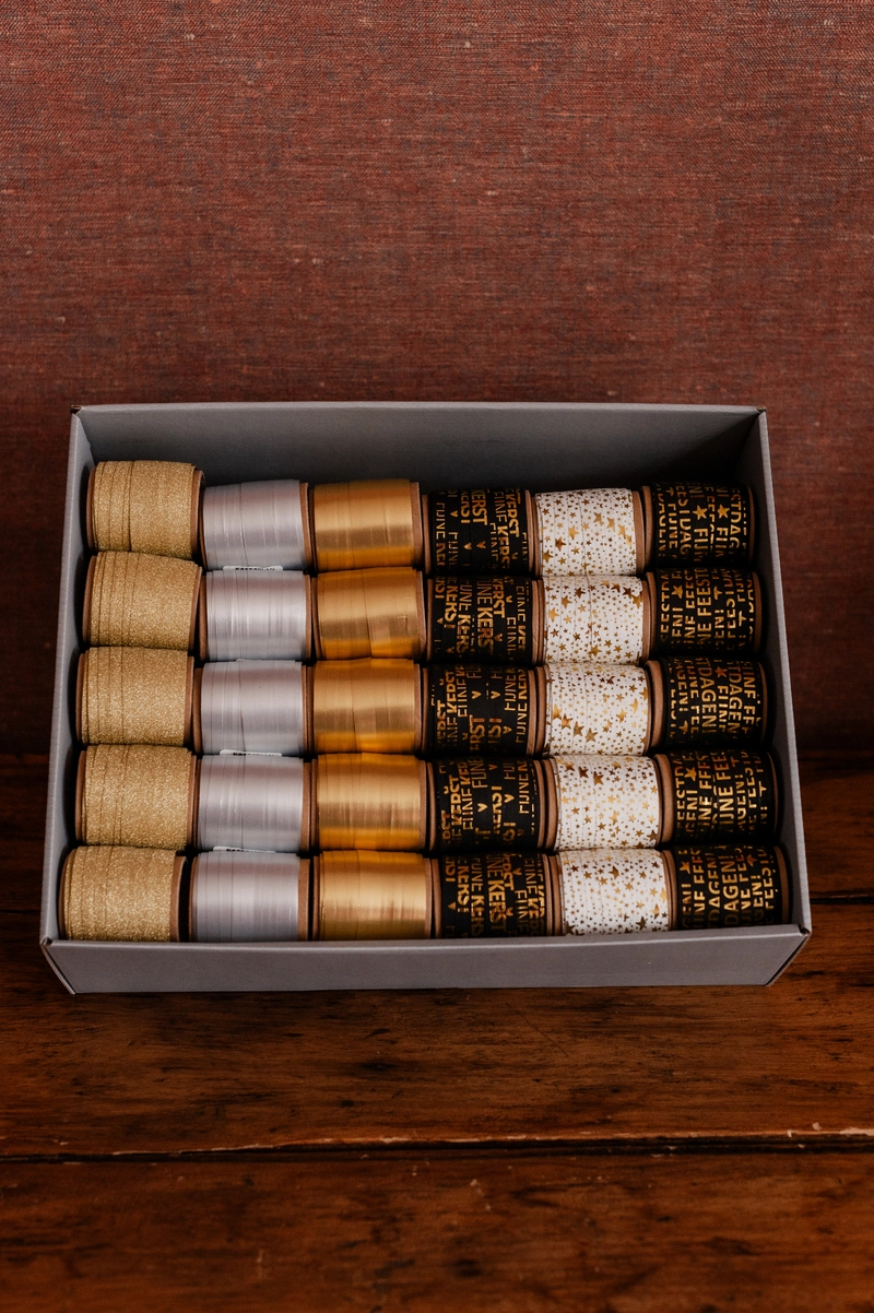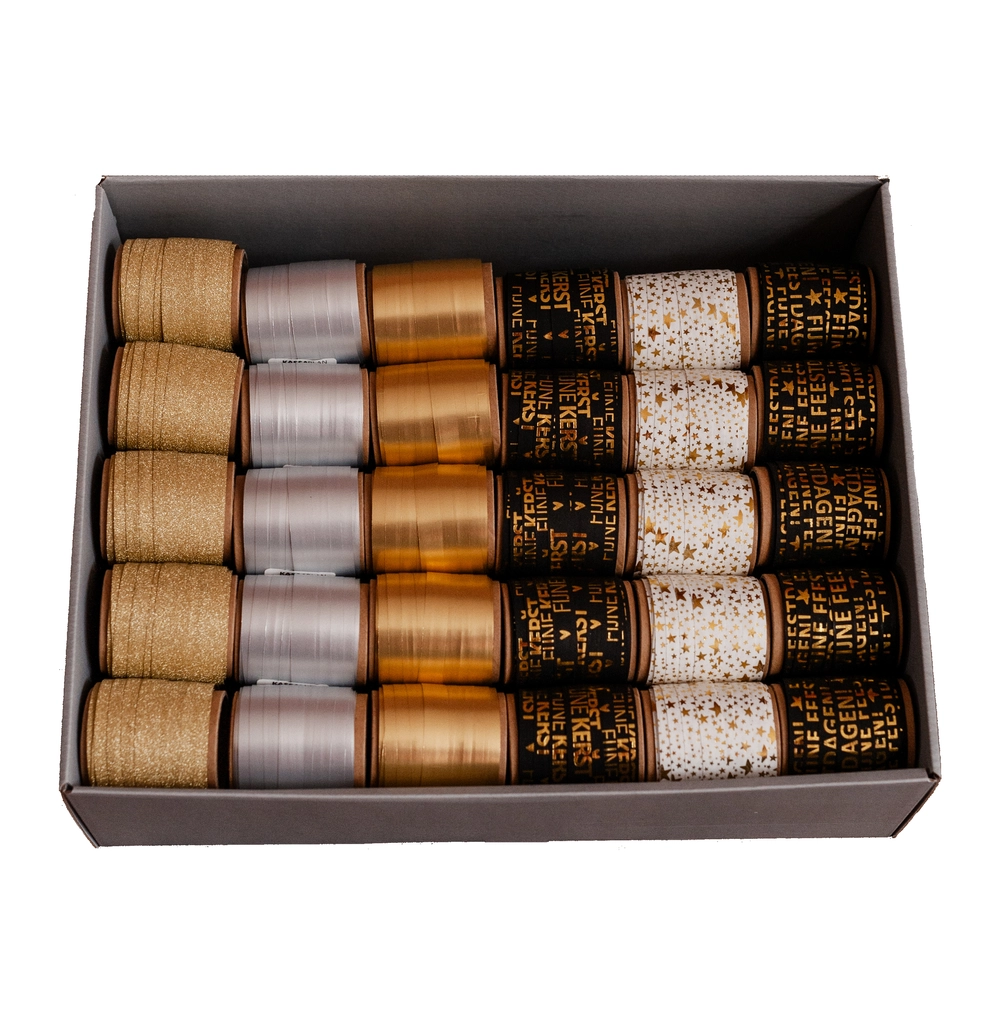 In dit pakket met 6 verschillende soorten linten ontvang je van elke lint 10 rollen. De volgende zitten in het pakket: