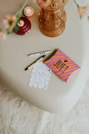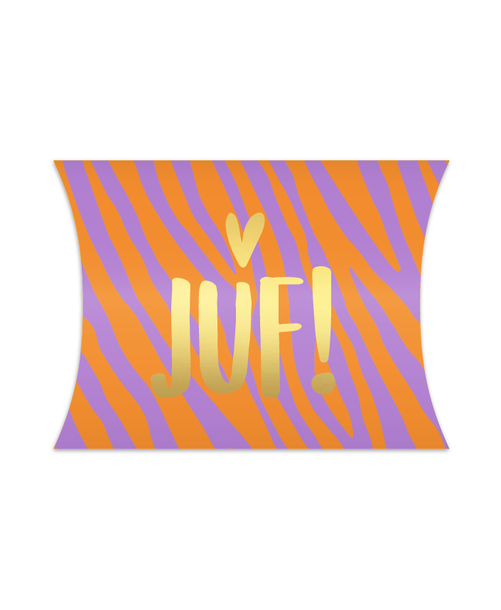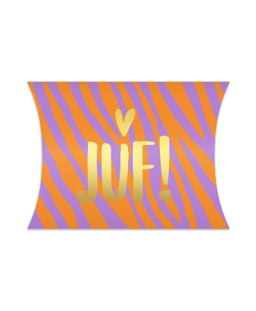 Dit stevige gondeldoosje (120x25x165mm) is ideaal voor het mooi verpakken van kleinere cadeaus. Het gondeldoosje "Juf!" met vrolijke paars / oranje kleuren is de perfecte verpakking voor de juf.