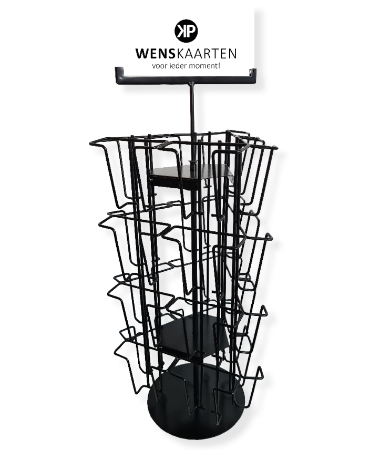 Een kaarthouder of kaartenmolen met 24 vakken is een veelzijdige en praktische oplossing om A6- en 1/3 A4-formaat kaarten met eventueel C6 (11,4 x 16,2 cm) enveloppen op een georganiseerde en aantrekkelijke manier te presenteren. Deze houder is ideaal voor gebruik in diverse settings, zoals winkels, beurzen, evenementen, horecagelegenheden, recepties en meer.