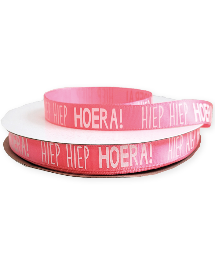 Trendy bedrukt satijn lint, Hiep Hiep Hoera Roze/Wit.
