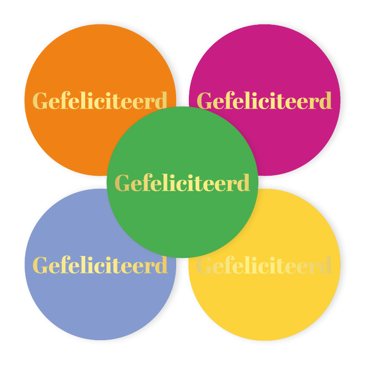 Rond wensetiket van 40mm met de tekst ‘Gefeliciteerd’ in diverse kleuren. Geschikt als sluitsticker of cadeausticker. Ideaal voor op een cadeauverpakking of bij verzending van een bestelling.