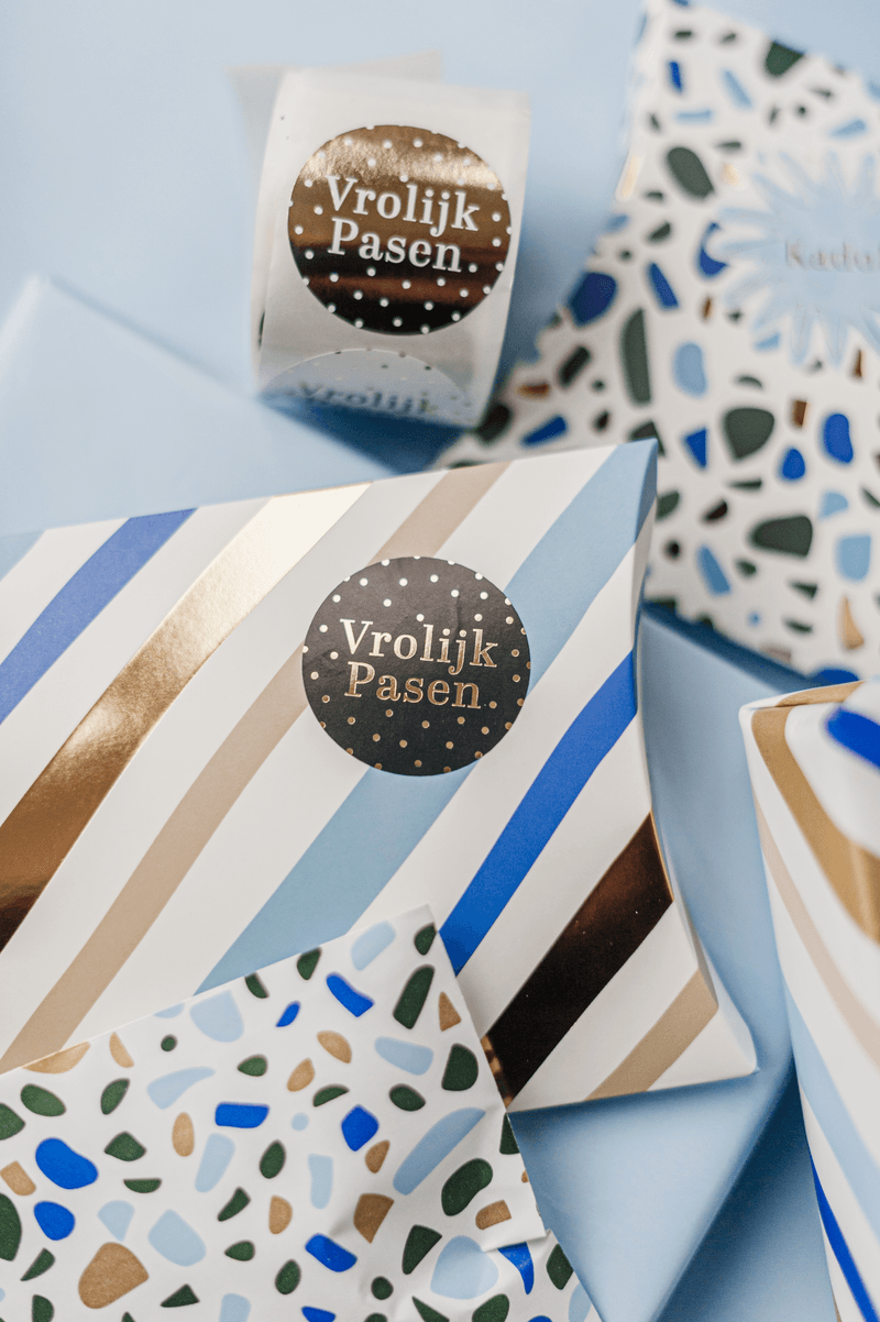 Deze stijlvolle 'Vrolijk Pasen' stickers geven een cadeautje een extra persoonlijk tintje. Ideaal als sluitsticker of om kleine geschenken liefdevol te presenteren voor Pasen.