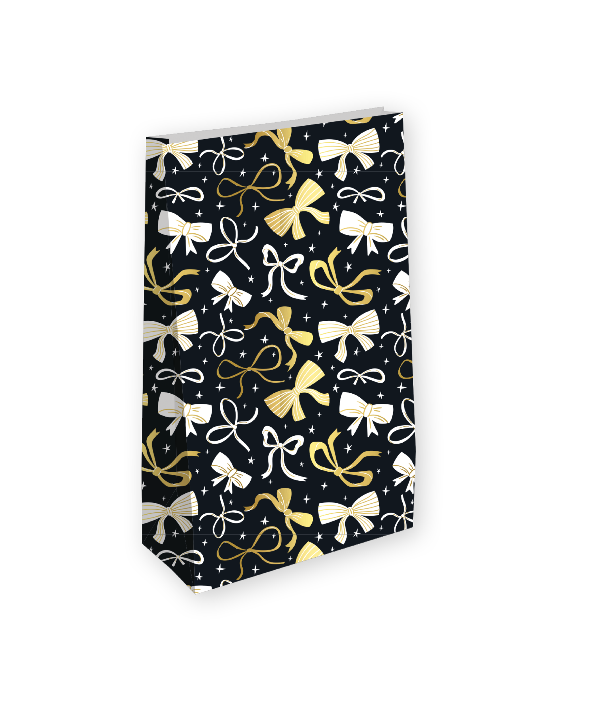 Leuke papieren zakjes van stevig kraftpapier in het design Bows black/gold. Ideaal voor het maken van traktaties, bedankjes of kleine cadeautjes.