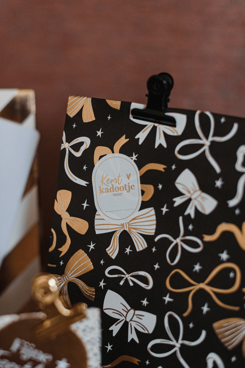 Een luxueus ogend cadeaulabel met zwarte en gouden strik, afgewerkt met goudfolie. De afmeting van 68x53 mm maakt het een chique accent bij elke verpakking. Deze luxe cadeaulabels zijn dubbelzijdig bedrukt en worden geleverd in een set van 30 stuks. Door het handige boorgat zijn ze eenvoudig te bevestigen met bijvoorbeeld een cadeaulint. Gebruik ze voor cadeaus, traktaties of als vrolijke verrassing.