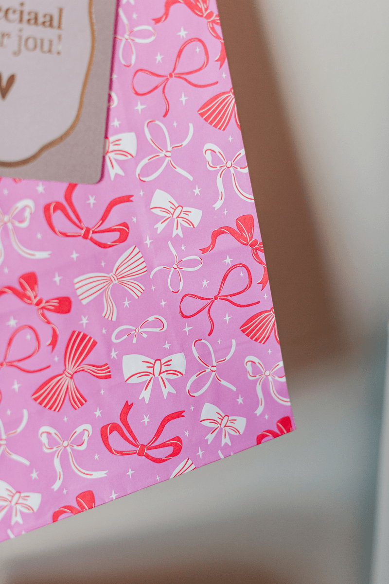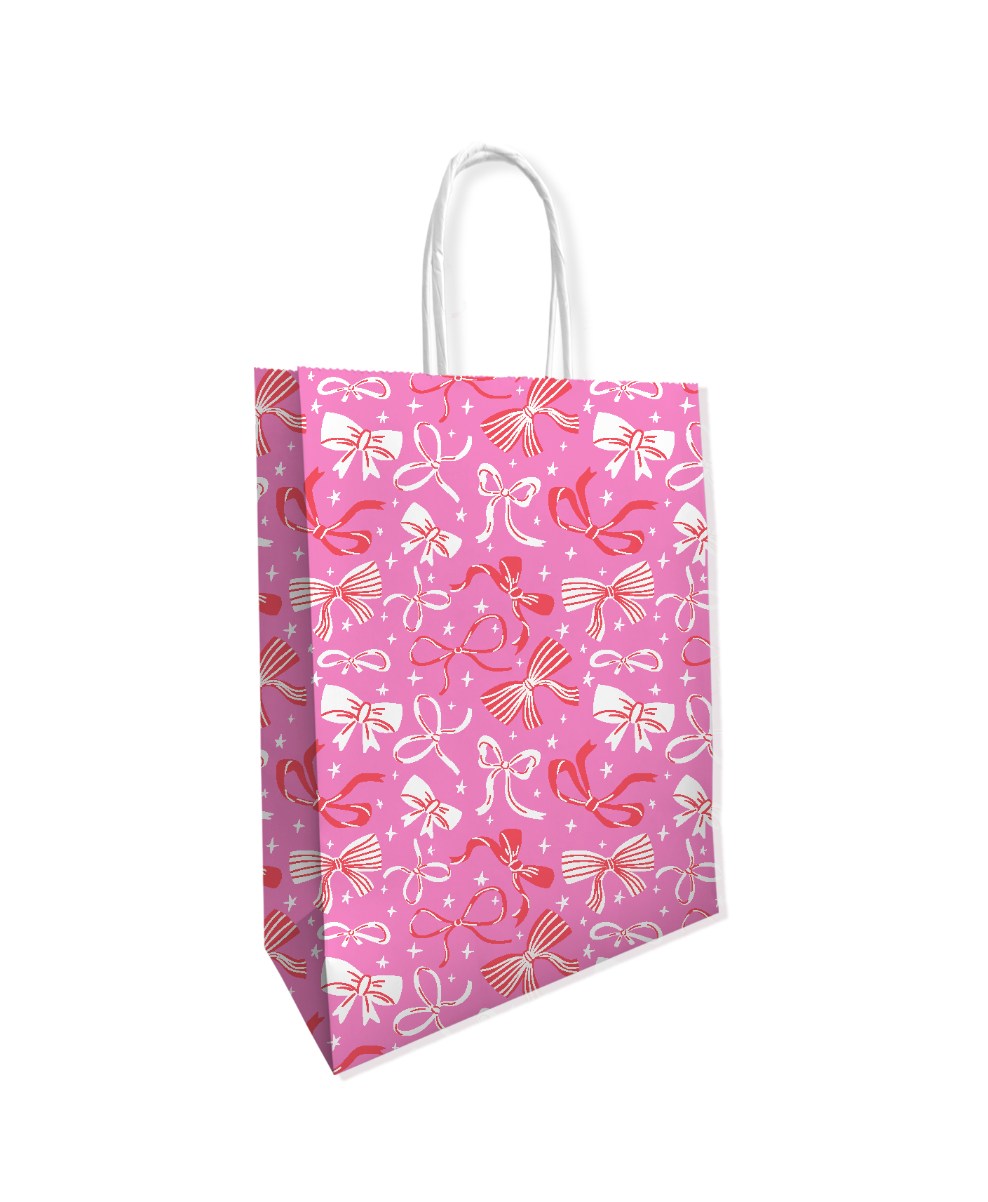 Vrolijke papieren tas (22+10x31 cm) met speels strikkenmotief in rood en roze. Deze milieuvriendelijke tas is een duurzaam alternatief voor plastic draagtassen. Gemaakt van stevig kraftpapier en voorzien van luxe gedraaide handgrepen voor extra comfort en stijl. Perfect voor cadeauwinkels, boetieks en feestelijke verpakkingen. Deze tas zorgt direct voor een vrolijke en verzorgde presentatie.