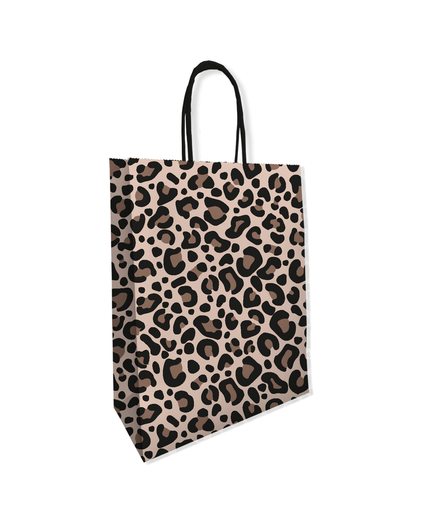 Trendy papieren tas (22+10x31 cm) met beige luipaarddessin. Deze milieuvriendelijke tas is een duurzaam alternatief voor plastic draagtassen. Gemaakt van stevig kraftpapier en voorzien van luxe gedraaide handgrepen voor extra comfort en stijl. Een echte eyecatcher voor modewinkels, events of geschenken. Voeg direct stijl en karakter toe aan je verpakkingen.