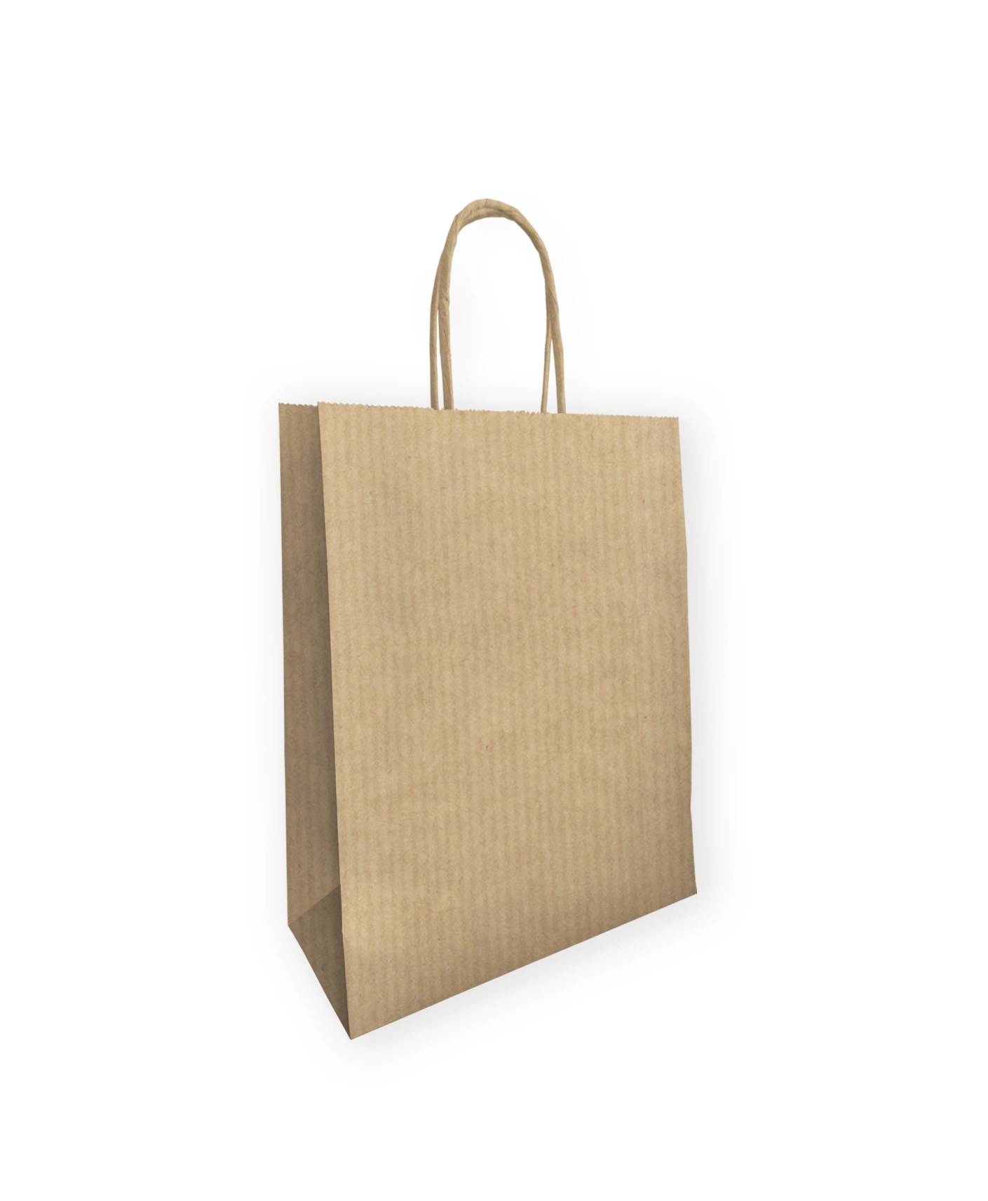Standaard model ribbed kraft papieren tas klein voorzien van luxe gedraaide handgrepen in dezelfde kleur. Deze tasjes worden veel gekozen door winkels voor het meegeven van kleding, woonaccessoires, beauty producten, boekjes en andere kleine artikelen.