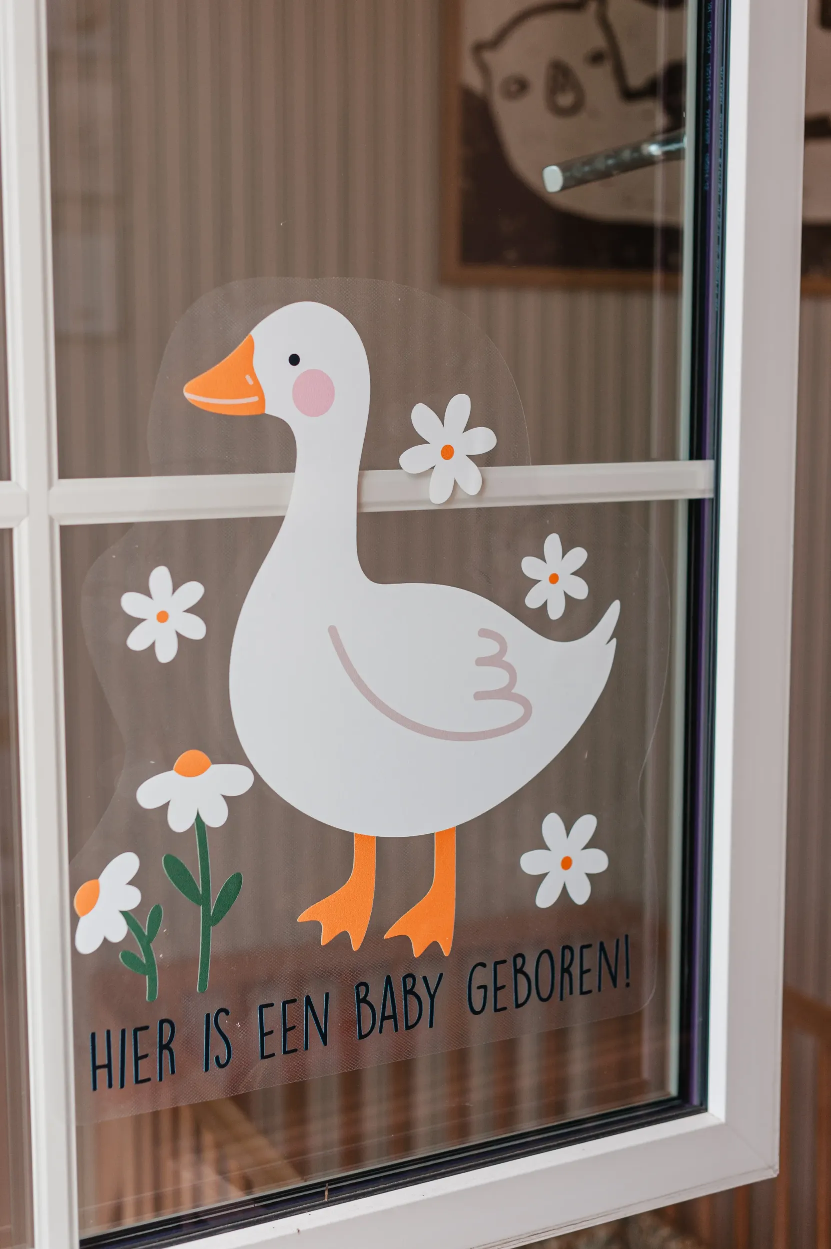 Vier het bijzondere moment met deze lieve raamsticker van een gansje op een transparante achtergrond, met daaronder de tekst ‘hier is een baby geboren’. Een zachte en feestelijke manier om het nieuwe leven aan te kondigen. De EasyDot-raamsticker is eenvoudig aan te brengen en herpositioneerbaar. Na gebruik verwijder je hem zonder lijmresten achter te laten. Perfect om dit mooie nieuws stijlvol te delen!