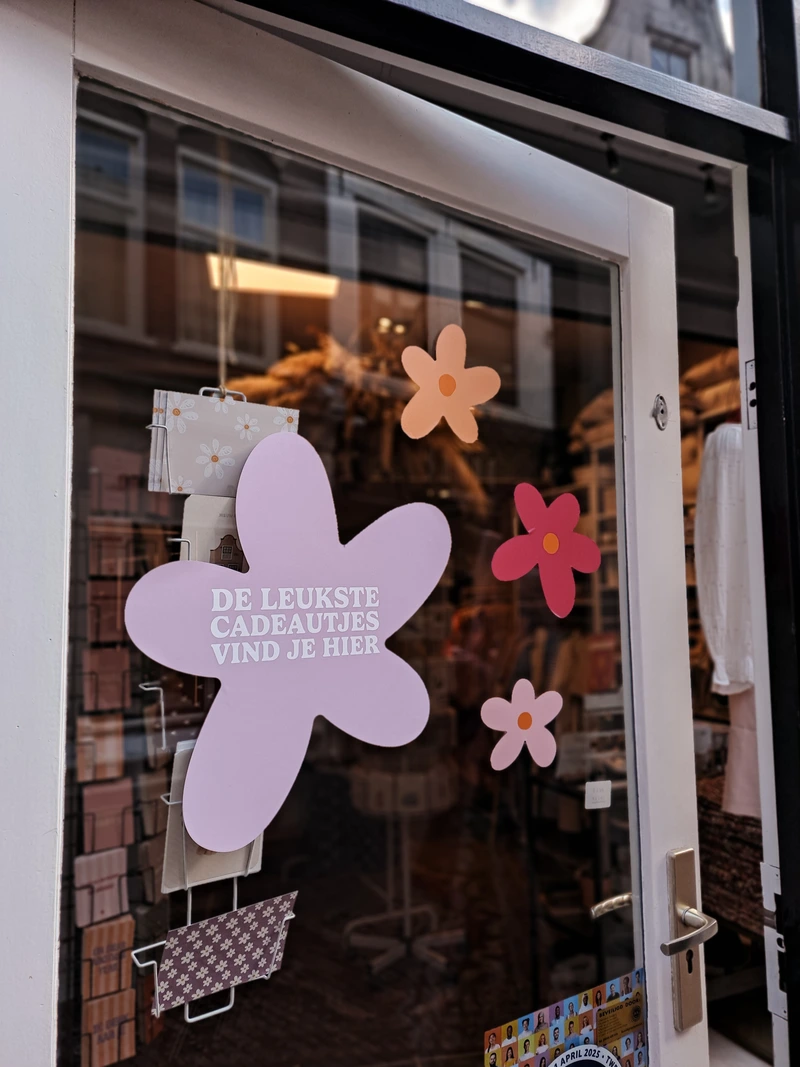 Nieuwe ontwerp raamsticker: Madelief met de tekst: De leukste cadeautjes vind je hier. Plaats uw raamdecoratie eenvoudig en zonder gedoe met EasyDot raamstickers. Deze innovatieve stickers zijn gemakkelijk aan te brengen, herpositioneerbaar en laten geen lijmresten achter. Transformeer uw ramen met onze unieke raamstickers.