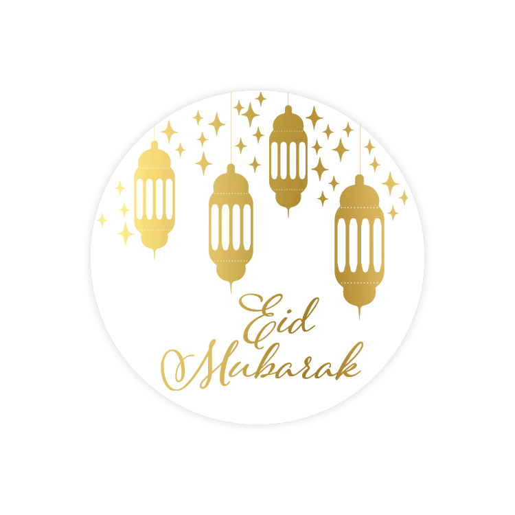 Stickers / Wensetiket / folie etiket rond met opdruk “Eid Mubarak”. Te gebruiken bij verzending van de bestelling of bij uw geschenk.