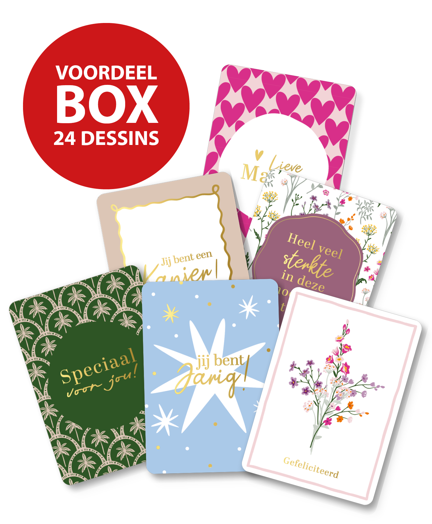 In dit pakket met 24 verschillende dessins ontvangt u van elk dessin 10 kaarten. De volgende wenskaarten zitten in dit pakket:
